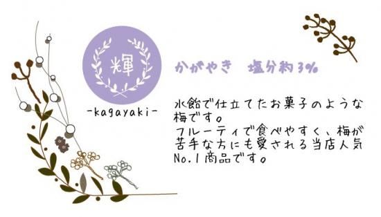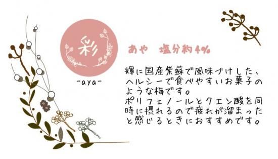 原材料 梅、漬け原材料(還元水飴、みりん、梅酢、食塩、清酒、しそ液、鰹エキス)酒精、甘味料(ステビア)
